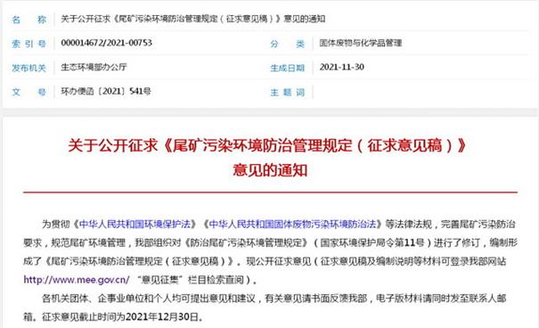 生態(tài)環(huán)境部將出臺(tái)尾礦污染防治管理新規(guī),新增多項(xiàng)處罰內(nèi)容,加大違規(guī)行為處罰力度。